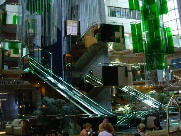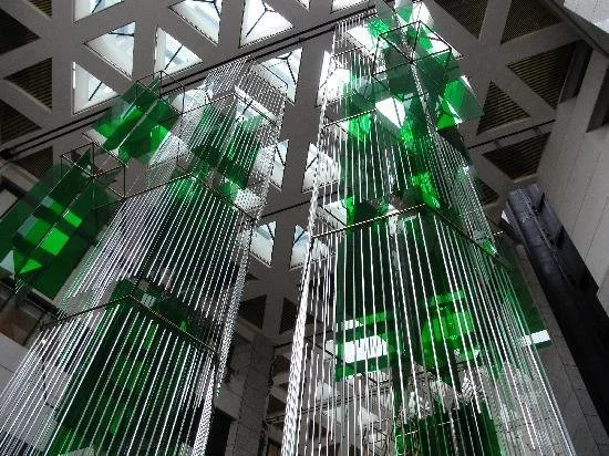 Built in 1990 and designed by architect C.W. Kim, the iconic The Emerald Plaza Building is San Diego’s most distinctive building to shape its skyline. The Flying Emeralds sculpture (now removed) was hanging in the center’s 100 foot high glass atrium. It has five hanging elements, each hexagonal in shape and resembling a metallic oriental lantern. Hanging from the outside of each element are long hexagonal prisms made of polished aluminium and hanging from the inside are sheets of emerald green acrylic.